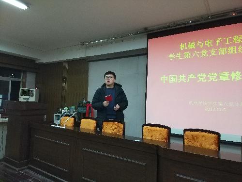 为引导同学们学习党章内容,深刻体会十九大精神,鼓励广大同学自觉关注时事,时刻与祖国同呼吸共命运,12月5日晚,成人短视频 学生第六党支部于成人短视频 三楼报告厅举办了以“中国共产党党章修订学习”为主题的组织生活活动。