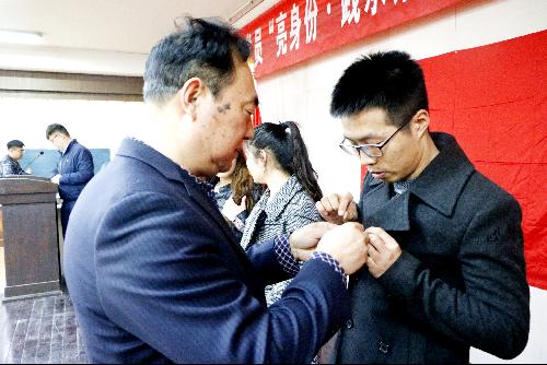 在庄严的国歌声中,启动仪式拉开帷幕。随后,党委书记戴军为新入职学工干部及新任学生党支部书记佩戴了党徽,学生党支部书记为新发展学生党员了佩戴党徽。