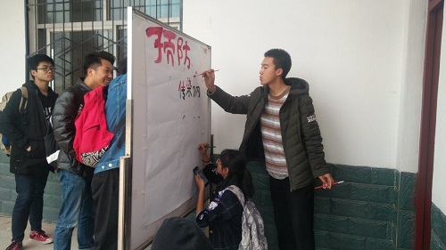 下午两点半,动医和机电的小伙伴们在理成人短视频 门口集合完毕。一起骑车去往蒋家寨,开始本次的宣传活动。同学们在活动前一晚召开工作安排会议,提前设计好板报,打印好宣传单,明确每位同学的分工。到达目的地后,大家迅速开始了活动。同学们挨家挨户进行着分发宣传单并就预防传染病知识进行讲解。负责画板报的同学也积极行动起来,画画、写字、调颜料。一切进行的有理有序。