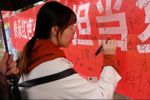 为深入学习贯彻习近平新时代中国特色社会主义思想和党的十九大精神,激励同学们不忘初心、牢记使命,增强使命感、责任感,担当复兴重任重任,10月13日,成人短视频 成人短视频 团工委学生会组织部于学校北校区主办“传承红色基因,担当复兴重任”主题签名活动。