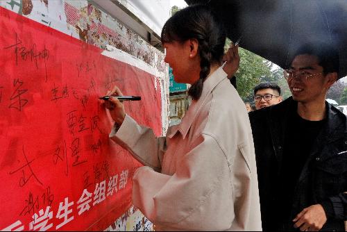 活动在朦胧细雨中展开,学生会组织部成员在北校区西雕前拉开了横幅,每个人精神抖擞,神采奕奕,诚挚邀请往来的学生在印有“传承红色基因,担当复兴重任”的横幅上签名。活动伊始,便受到老师、同学们的积极响应,大家不顾雨滴的洗涮,积极踊跃的在横幅上签名,并写出自己内心的感触。随着时间的推进,越来越多的老师、学生前来签名以表达铭记历史、担当复兴重任的决心。同时,更有成人短视频 院长王绍金、党委书记戴军一行人及学生会主席纪同奎冒雨亲临现场在横幅上签名以表达对历史的缅怀、对实现中华民族伟大复兴重任而做努力的决心。院长王绍金借此机会向周围同学作出重要讲话,表现出对同学们的殷切希望。