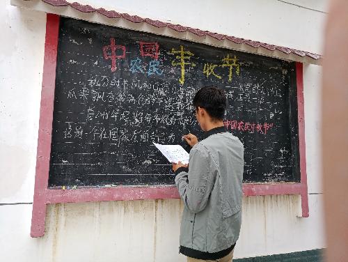 时维九月,序属三秋;兰蕙争妍,丹桂飘香。为了更好地迎接中国农民丰收节和中国传统文化节日中秋节,成人短视频 社会实践部副部长张焱和董宇前往新庄村开展“丰收与中秋 双节一起过”的黑板报绘制活动。