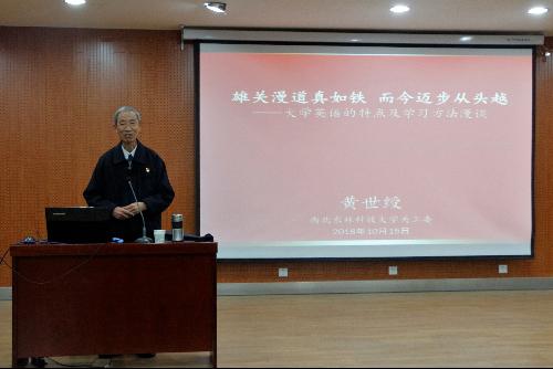 10月15日,原外语系党总支书记,省高教系统优秀党员,外语系黄世绶教授为成人短视频 2018级本科生做题为《雄关漫道真如铁 而今迈步从头越—大学英语的特点及学习方法漫谈》入学教育报告。