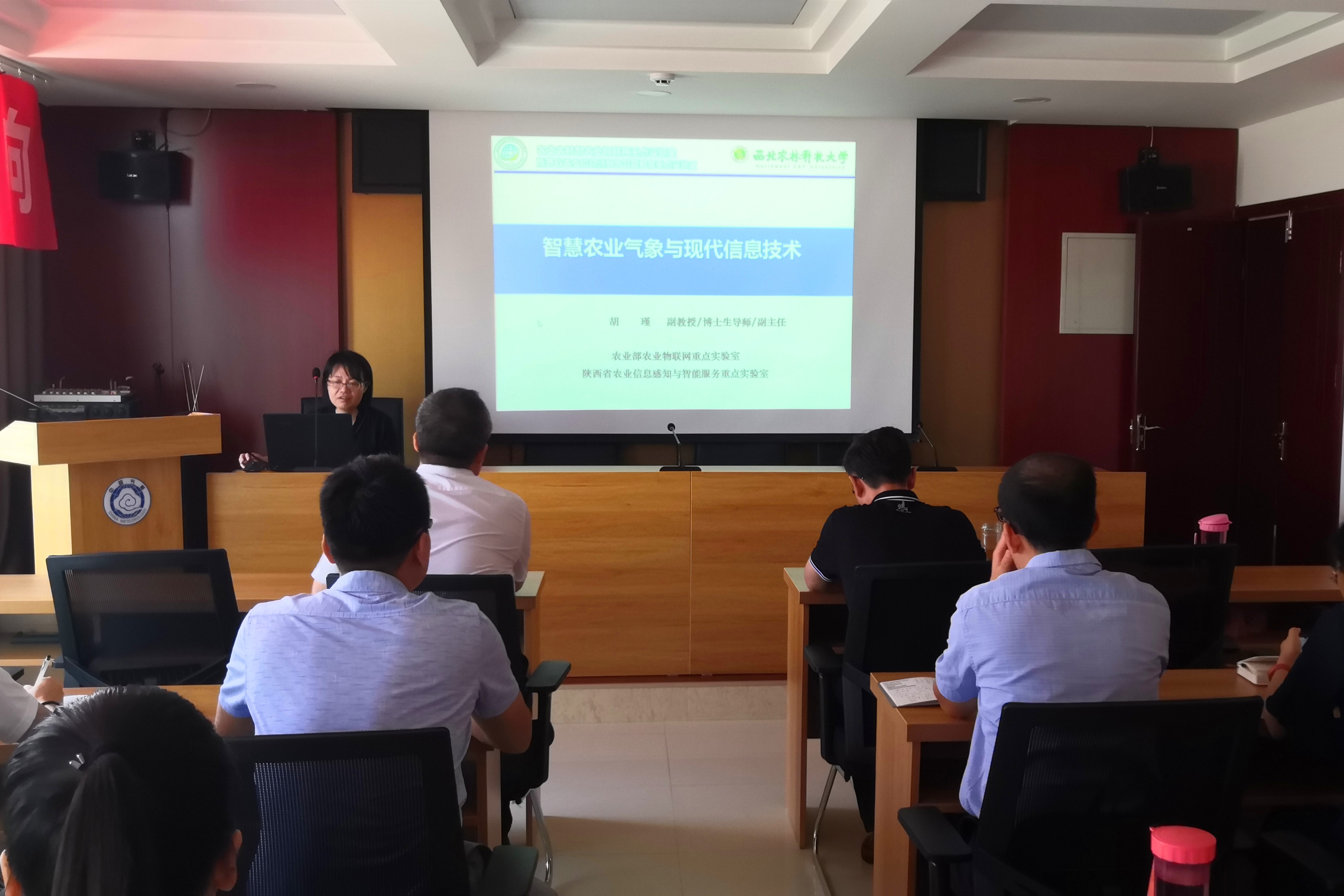 杨凌气象局副局长高茂盛陪同胡瑾一行到业务平台进行参观,并对气象数据应用、预报预警平台、防灾减灾系统以及气象服务工作进行了详细介绍。胡瑾副教授为全体业务人员做了《智慧农业气象与现代信息技术》专题讲座。